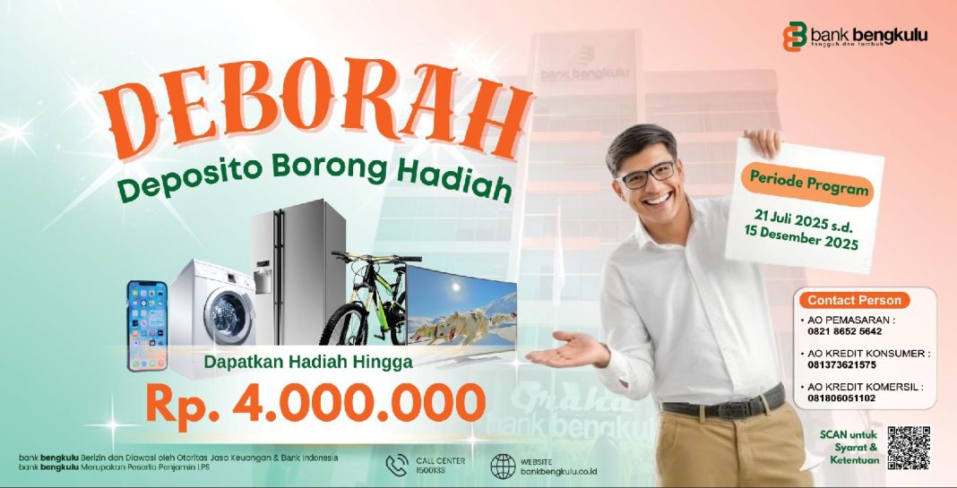 Bank Bengkulu hadirkan Program Deposito Borong Hadiah (Deborah). Program spesial bagi nasabah setia ini resmi dimulai pada 21 Juli 2025 hingga 15 Desember 2025.